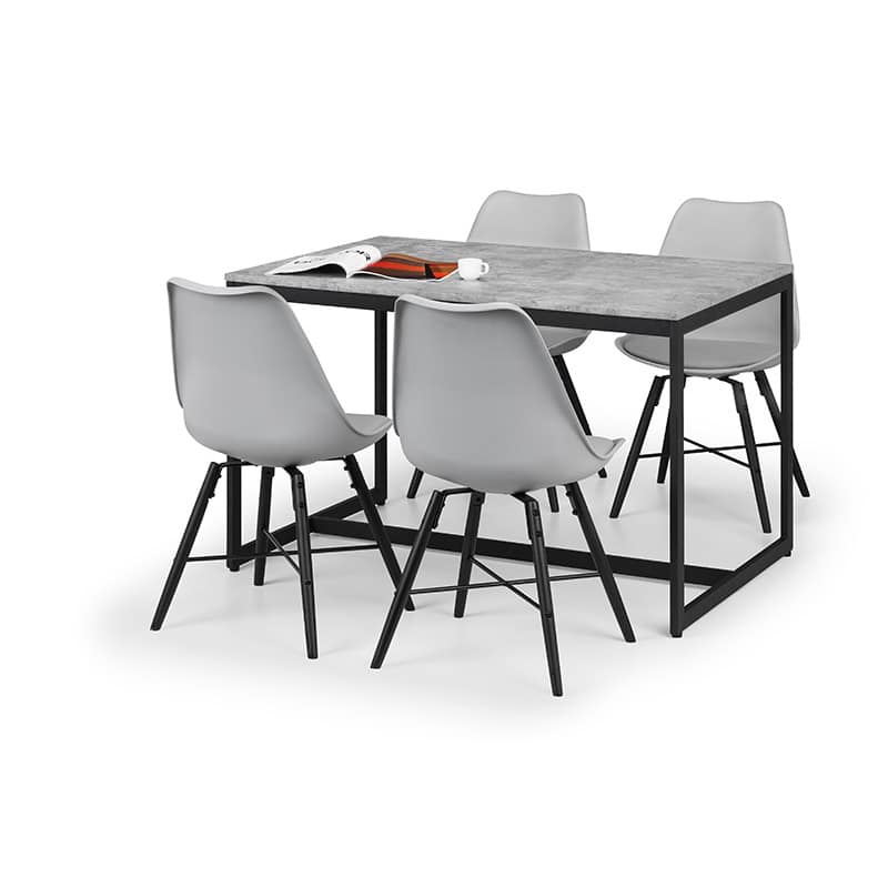 Simplistic in design with a contemporary style, the Staten dining table will add a stunning industrial look to any living and dining area. Constructed from a black coated metal frame, complemented by a striking concrete effect tops, to create a very stylish, modern product. Featured with 4 Kari grey dining chairs. The Kari Dining Chair features a curved design that conforms to the natural curve of the spine, paired with a high-quality padded seat allowing you to reach maximum comfort. Featuring a black, easily-cleaned seat and black legs, with an steel cross bar giving this chair a modern industrial feel.