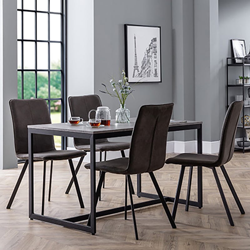 Simplistic in design with a contemporary style, the Staten Dining Table will add a stunning industrial look to any living and dining area. Constructed from a black coated metal frame, complemented by a striking concrete effect tops, to create a very stylish, modern product. Featured with 4 Monroe dining chairs. The Monroe dining chair combines a retro flair with a contemporary design, perfect for the modern home. Upholstered in a charcoal grey microsuede fabric, with powder coated steel legs, this sturdy design offers a modern, netural design perfect for a range of decor.