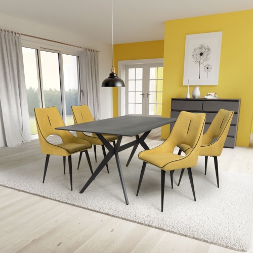 This trendsetting dining set combines a sintered stone 1.6-metre table with four ultra-modern dining chairs. This sturdy, reflective black table comfortably seats four people. The futuristic hole-back chairs are upholstered in yellow chenille-effect fabric with striking black piping. The table and chairs come with stylish matching black metal legs. Assembly required.