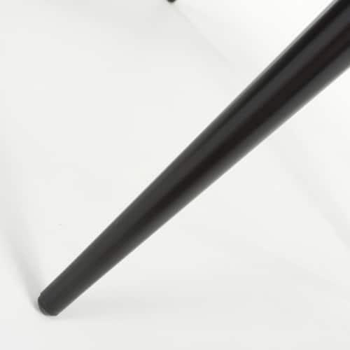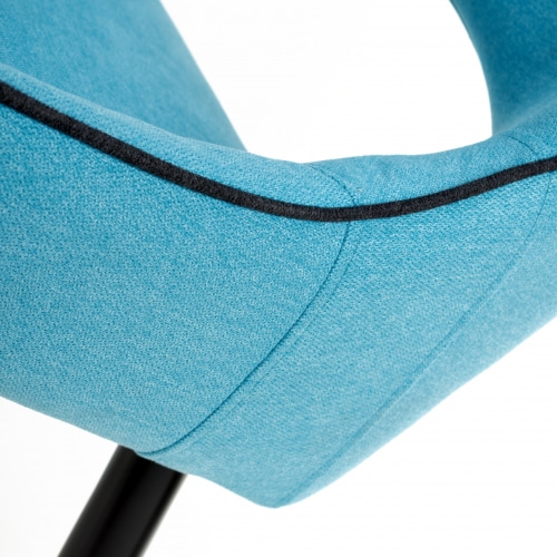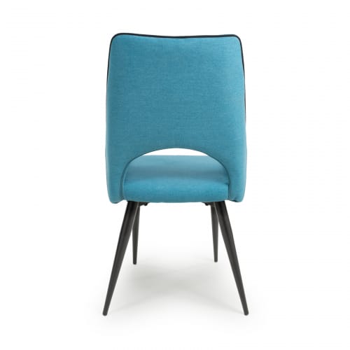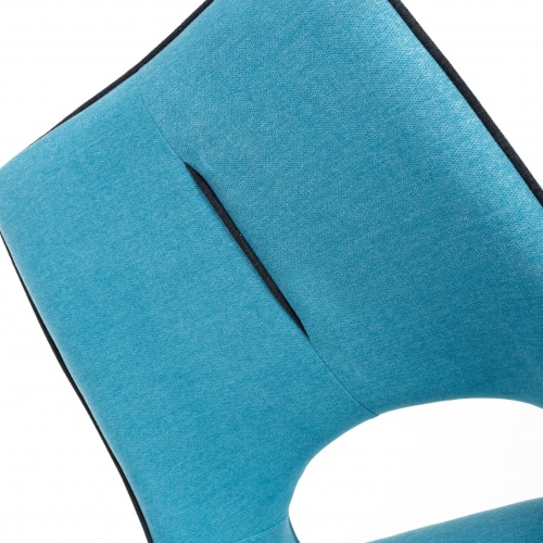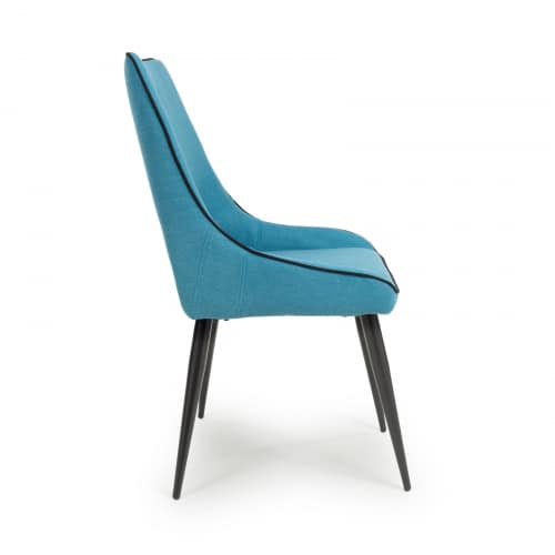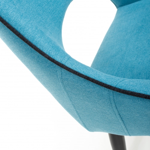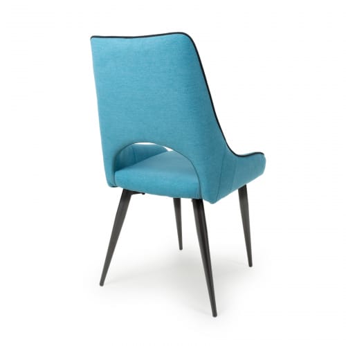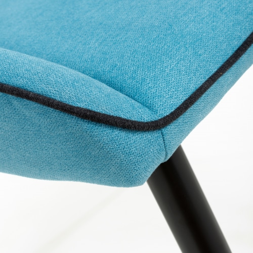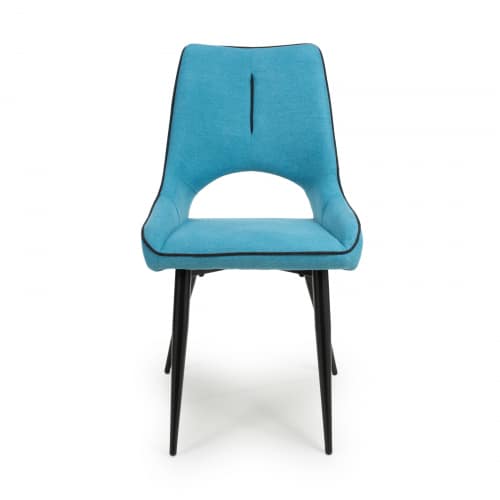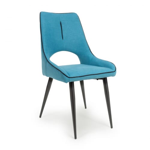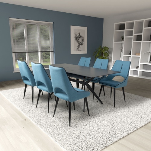 This trendsetting dining set combines a sintered stone extending table with six ultra-modern dining chairs. This sturdy ceramic reflective black table easily pulls out to extend from 1.4m to 1.8m, comfortably seating 6 people. The futuristic hole-back chairs are upholstered in blue chenille-effect fabric with striking black piping. The table and chairs come with stylish matching black metal legs. Assembly required.
