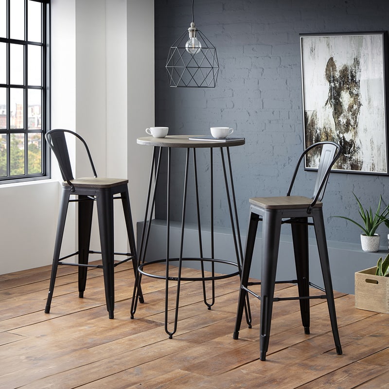The Dalston Round Bar Table features hair pin legs giving a modern, industrial look to any room. Crafted from solid Elm wood and Satin Black powder coated steel, this bar table offers a durable, sturdy space-saving construction. Pair up with the Dalston Bar Stool or Spitfire Bar Stool for an industrial bar set.