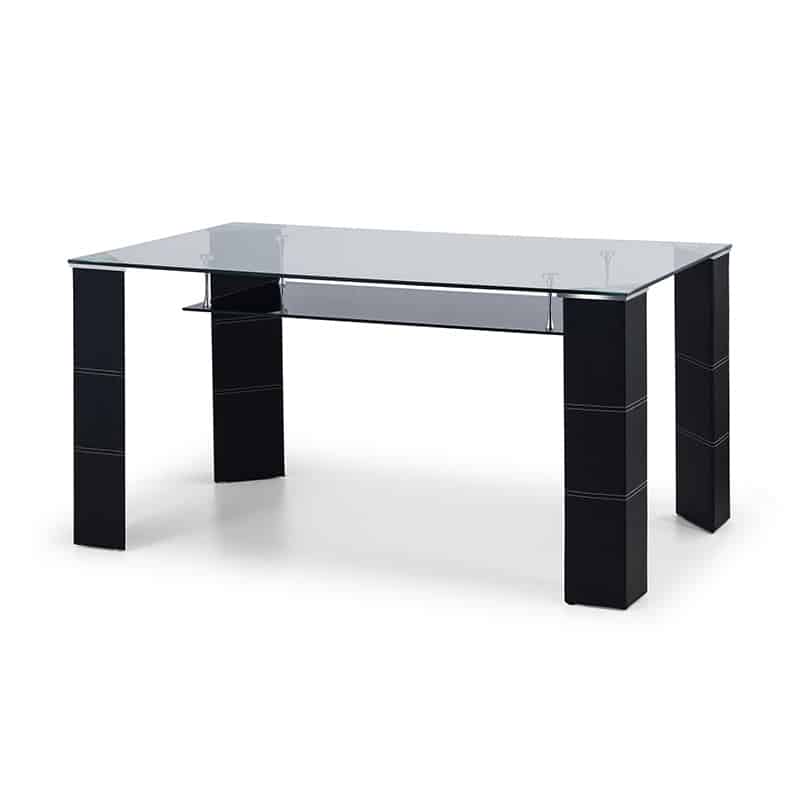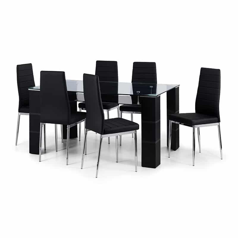 This sleek Greenwich dining table features a 10mm clear tempered glass table top with black faux leather legs and chrome plated steel, ensuring lasting durability. A useful black glass under shelf is provided, allowing extra storage. The Greenwich dining table will comfortably seat 6 people, creating a modern setting for your guests.