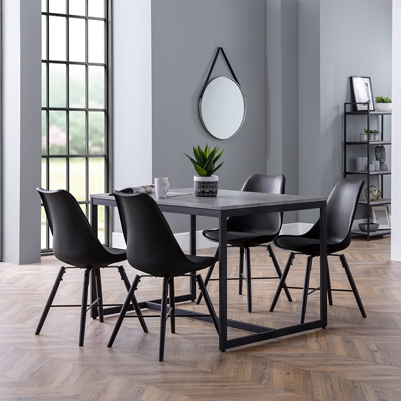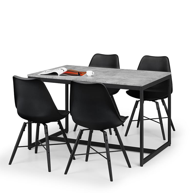 Simplistic in design with a contemporary style, the Staten Dining Table will add a stunning industrial look to any living and dining area. Constructed from a black coated metal frame, complemented by a striking concrete effect tops, to create a very stylish, modern product. Part of the Julian Bowen Staten Dining and Occasional Collection.