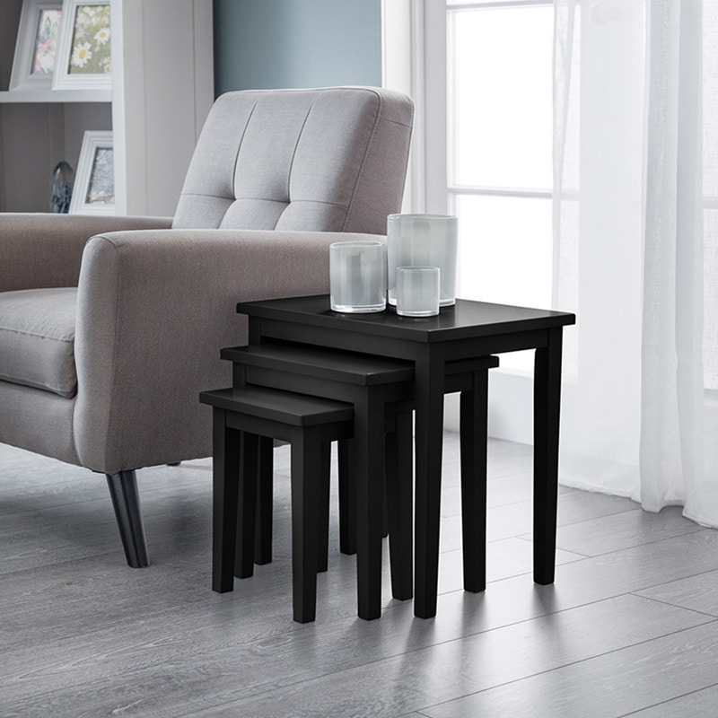 Cleo is a stylish and practical range of dining and occasional furniture which offers outstanding value for money. Its timeless design complements contemporary and traditional interior styles equally well. The Cleo black nest offers great versatility, comprising 3 tables crafted from solid rubberwood and finished with a black lacquer.