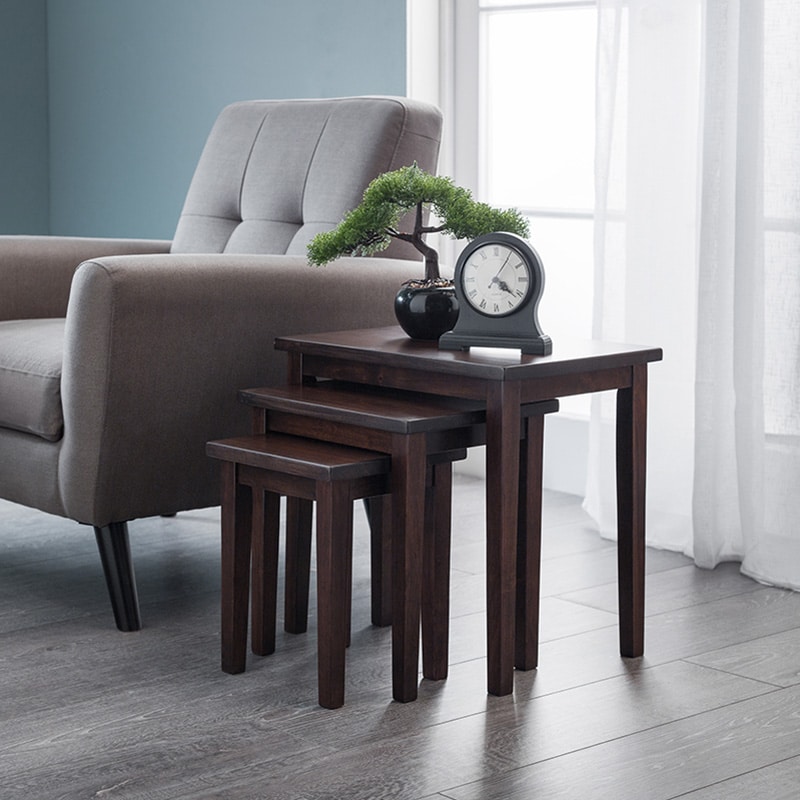 Cleo is a stylish and practical range of dining and occasional furniture which offers outstanding value for money. Its timeless design complements contemporary and traditional interior styles equally well. The Cleo Mahogany nest offers great versatility, comprising three nesting tables crafted from solid rubberwood and finished with a mahogany stain to offer a versatile space-saving solution. Part of the wider Cleo Mahogany Dining and Occasional range from Julian Bowen.