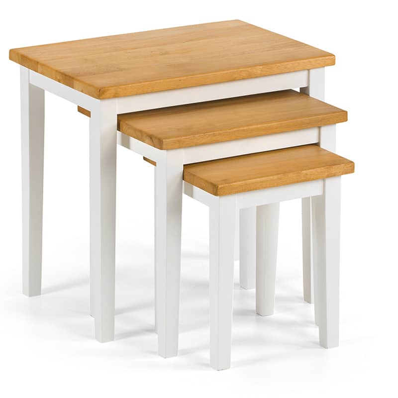 Cleo is a stylish and practical range of dining and occasional furniture which offers outstanding value for money. Its timeless design complements contemporary and traditional interior styles equally well. The Cleo two tone nest offers great versatility, comprising 3 tables crafted from solid rubberwood and finished with a light oak stain and white coloured frame.