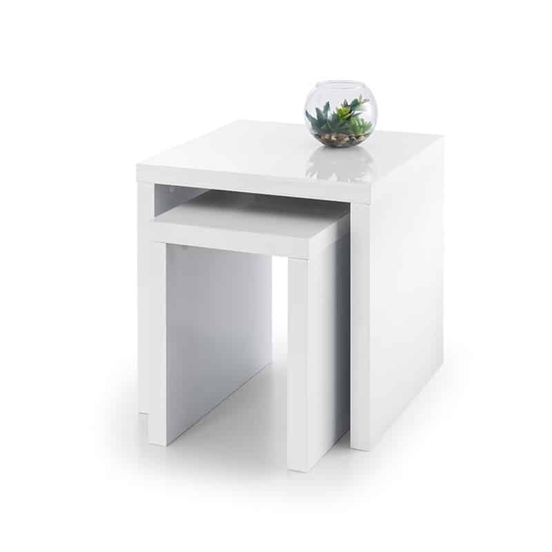 - Practical & compact high gloss nest of 2 side tables in white lacquered finish.