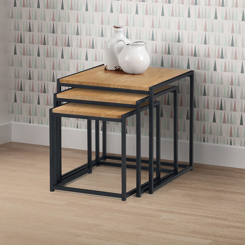 A cool, modern nest of tables designed to add a contemporary touch to any home or work place. Its simple clean lines, delineated by a subtle, black coated metal frame are complemented perfectly by a stunning euro oak foil, to create a very stylish and sleek product.