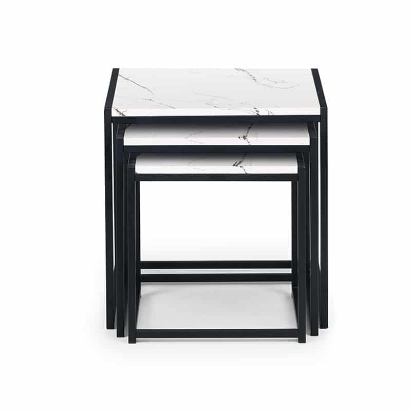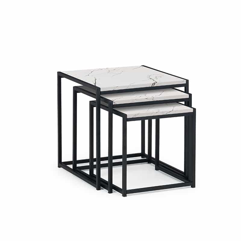 A cool, modern nest of tables designed to add a contemporary touch to any home or work place. Its simple clean lines, delineated by a subtle, black coated metal frame are complemented perfectly by a modern, white marble foil, to create a very stylish and sleek product.